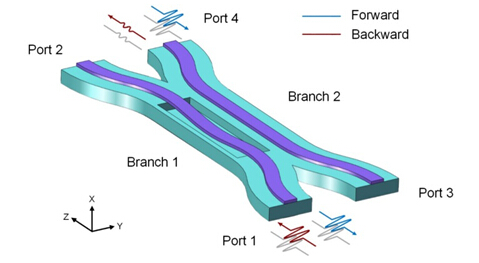 武汉光电国家实验室光电子器件与集成功能实验室张新亮教授、施雷讲师和硕士生王哲奇等人,利用波导中的光梯度力提出了一种新颖的集成无源非互易器件。该器件基于非对称光力耦合器,其中一支是悬空的波导,另一支是固定在衬底上的波导。当光经过悬空波导时,波导发生弯曲,相应地其有效折射率也发生改变。正向传输的光和反向传输的光,引起悬空波导的弯曲程度不同,因而器件的正反向透过率不同。这一器件结构设计简单,而且具有大工作带宽(13.1 nm)和超低工作功率(390 μW)。相比已报道的无源光非互易方案,该方案有更好的应用前景。审稿人对此评价:“ This is a potentially very interesting device and may have important applications. This work is of significant interest for optomechnanics and also within the photonics area.”