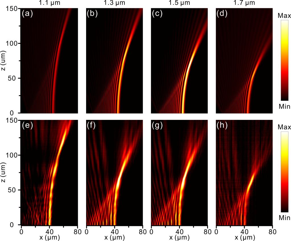 艾里光束由于具有无衍射、自弯曲及自愈合等良好的特性,在显微成像、激光微加工及光学显微操作等方面均有广泛的应用。近年来,研究人员报道了基于超表面的艾里光束产生器,其克服了基于透镜及相位板等传统光学器件产生艾里光束需要复杂光路、庞大体积等问题,具有紧凑、易集成等优势。但是,目前已报道的艾里光束产生装置大多基于共振原理,因此无法宽带工作。同时,由于金属的欧姆损耗在近红外波段较大,因此基于金属超表面的艾里光束产生器在近红外效率均较低。