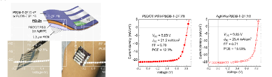 图(a)超薄有机太阳能电池的器件结构和实物图;图(b)超薄有机太阳能电池在PEDOT:PSS和AgNWs电极上的器件性能