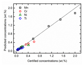 图2. 采用OP-MLC-LIBS方法对Mn、Cr、Ni和Ti元素含量的预测结果与标定值的比较。虚线表示探测含量和标定含量的理想关系。