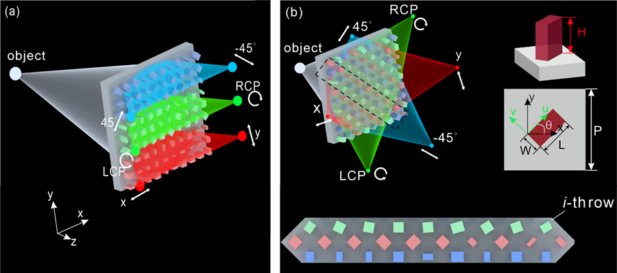 图 1. 超构表面偏振成像仪。 (a) 分区排布超构表面偏振仪。 (b) 间隔排布超构表面偏振仪。
