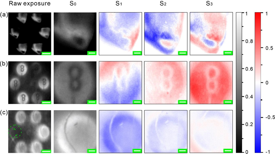 图 3. 全斯托克斯参量成像实验。 (a) 石英块成像结果。 (b) 塑料尺成像结果。 (c) 鱼鳃装片成像结果。